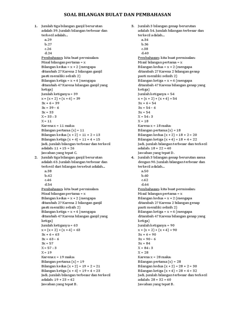 Berikut dijelaskan mengenai bilangan ganjil dan genap beserta contohnya. Cara yang akan digunakan dalam menyelesaikan soal ini sangatlah mirip dengan soal yang sudah saya bahas sebelumnya. Contoh soal hasil bilangan genap Ok, mari kita lihat lagi soalnya ya. Temukan tiga bilangan genap berurutan yang jumlahnya sama dengan 150.